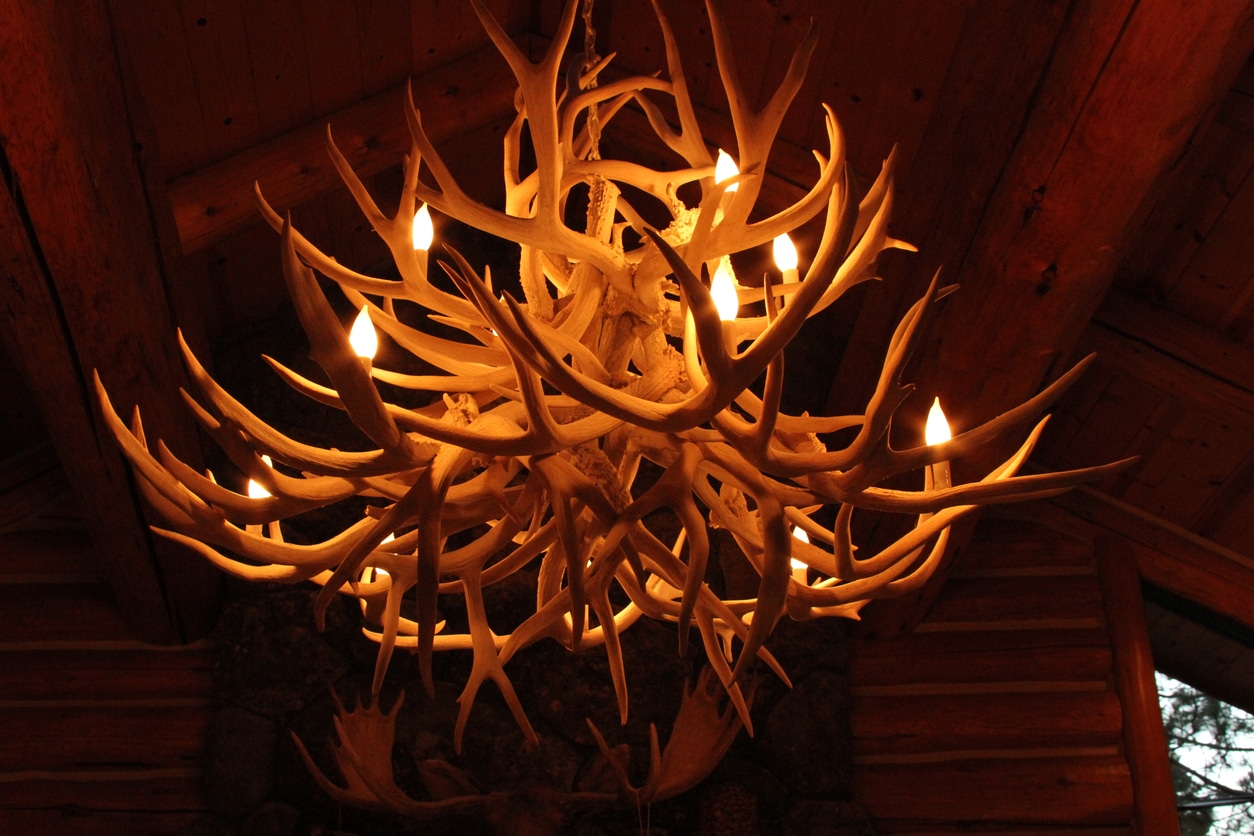 These chandeliers were manufactured from naturally shed elk antlers. They came in three finishes: natural, sun-bleached, and black.